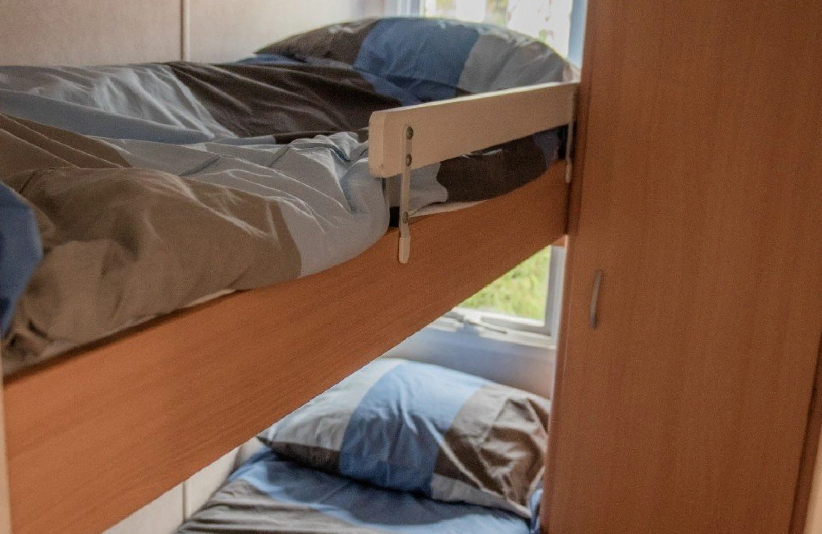 - Ein Schlafzimmer mit zwei Einzelbetten und zusätzlichem Hochbett, ebenfalls mit Bettdecken, Bettwäsche und Kissen